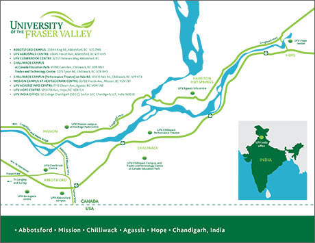 Hallmarks of the region include a temperate climate, beautiful scenery, a wide range of outdoor activities, and many local shopping centres, restaurants, and recreational facilities. UFV is a multi-campus institution, with campuses and locations in Abbotsford, Chilliwack, Mission, Hope and Agassiz, and a growing presence in Chandigarh, India.