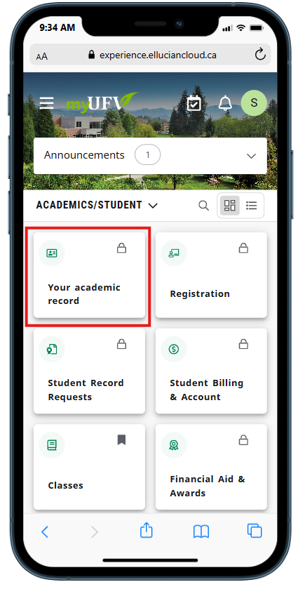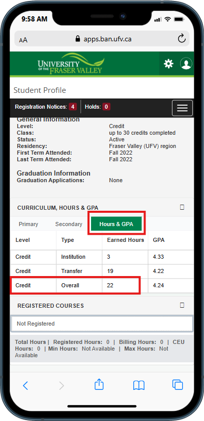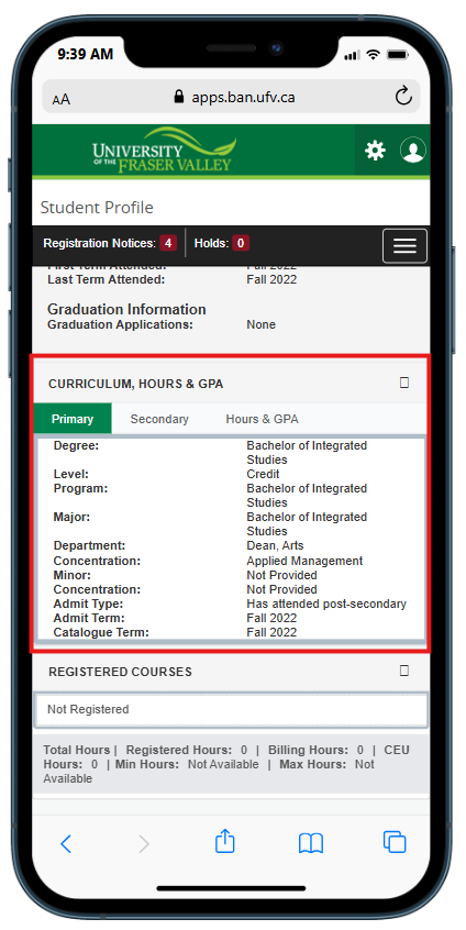 On a mobile device, scroll down to the Curriculum, Hours & GPA section. You will see your program of study information, including the degree, program, major, and minor you're enrolled in (if applicable.)